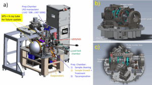 Figura 3 – Estágio final de montagem do novo equipamento. Em detalhe, medida com resolução atômica de HOPG a 5~K. https://www.linkedin.com/feed/update/urn:li:activity:7390003633892892672 (ver vídeo nas redes sociais) b) Equipamento durante o processo de baking (Nov/2025). Em detalhe, espectrômetro Raman Nanofinder montado.